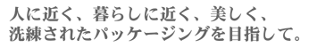 | 当社はパッケージ業界の一翼を担うものとして、"今までになかったカタチでパッケージに"とのスタンスで、お得意様とともに新機能・美しさを企画し新たなマーケットを創出。新しい"パッケージング"を提案していくエッセンス・カンパニーとしての自負をもって歩んでいきます。 |